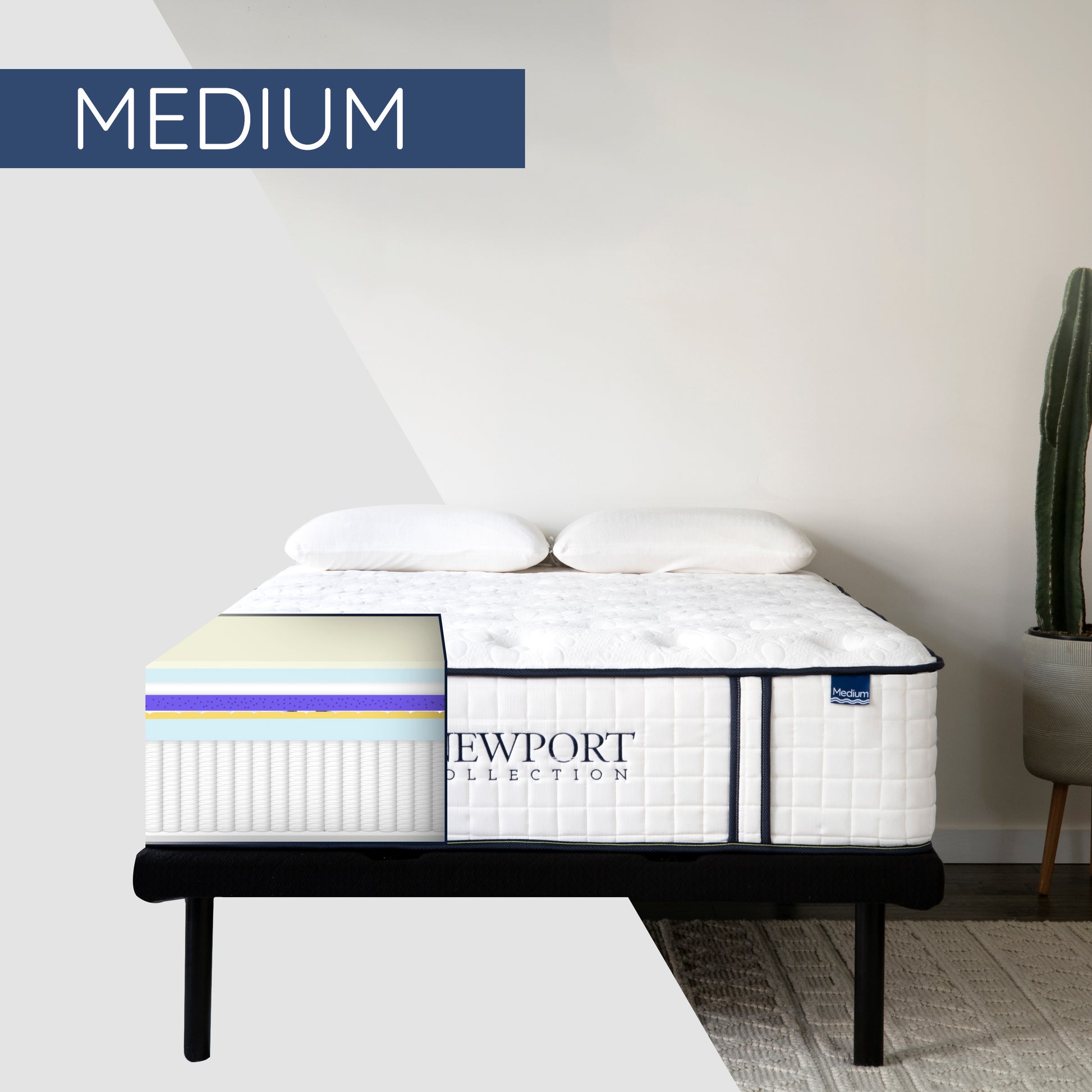 Together, these layers give the Newport Medium its signature “comfort-plus-support” feel—plush enough to cradle pressure points, yet firm enough to maintain alignment and edge stability.